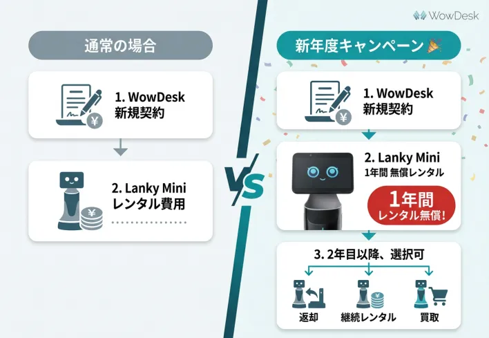 概要:クラウド型受付システム「WowDesk」を新規でご契約いただいたお客様に、AI受付・案内ロボット「Lanky Mini」のレンタル費用を1年間無料(条件あり)でご提供します。